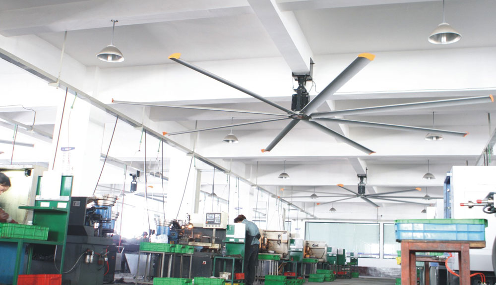 我公司生產的大型工業吊扇直接懸掛在廠房屋梁下,風力柔和,能加快車間空氣流通,有效降低車間內溫度,改善車間空氣環境質量,有利于員工的身體健康。
